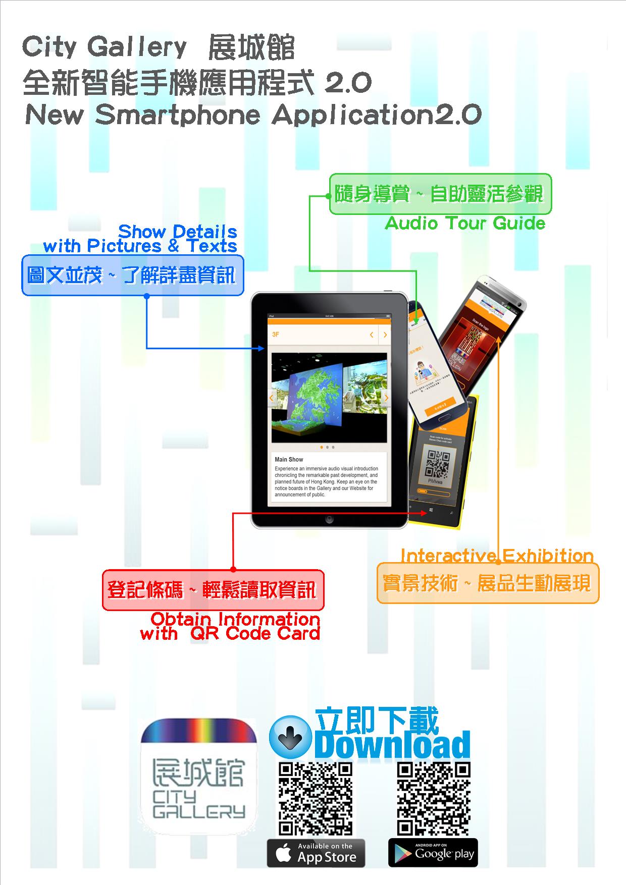 請瀏覽Play Store或Apple Store下載「展城館」智能手機應用程式2.0 (IOS及Android),或使用以下捷徑。